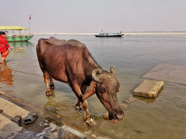 Anche le sacre mucche si lavano nel fiume e qualcuno, con molta naturalezza, dona alla riva del Gange i suoi bisogni corporali.